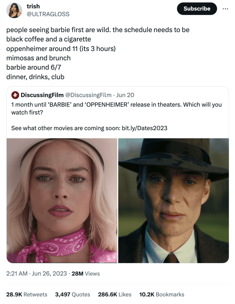 I experienced this firsthand. When my friend and I planned to see both films back-to-back, it wasn’t just about watching movies, it was about engaging with the marketing moment itself. We dressed according to each film’s aesthetic, moving from the muted tones of Oppenheimer to the vibrant, playful world of Barbie. What stood out most was how many others were doing the same, reinforcing how deeply the marketing had embedded itself into the audience experience.